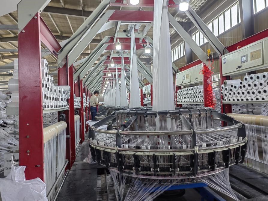 走进京兰包装生产车间,在现代化的生产流水线上,一排排拉丝机、圆织机、切缝机整齐划一。伴随着隆隆的机器声,一条条崭新的塑料编织袋不断地被“吐”出来。十数名工人忙碌穿梭,对各类编织袋进行生产加工、包装等流水作业,整个车间呈现出一片忙而有序的景象。