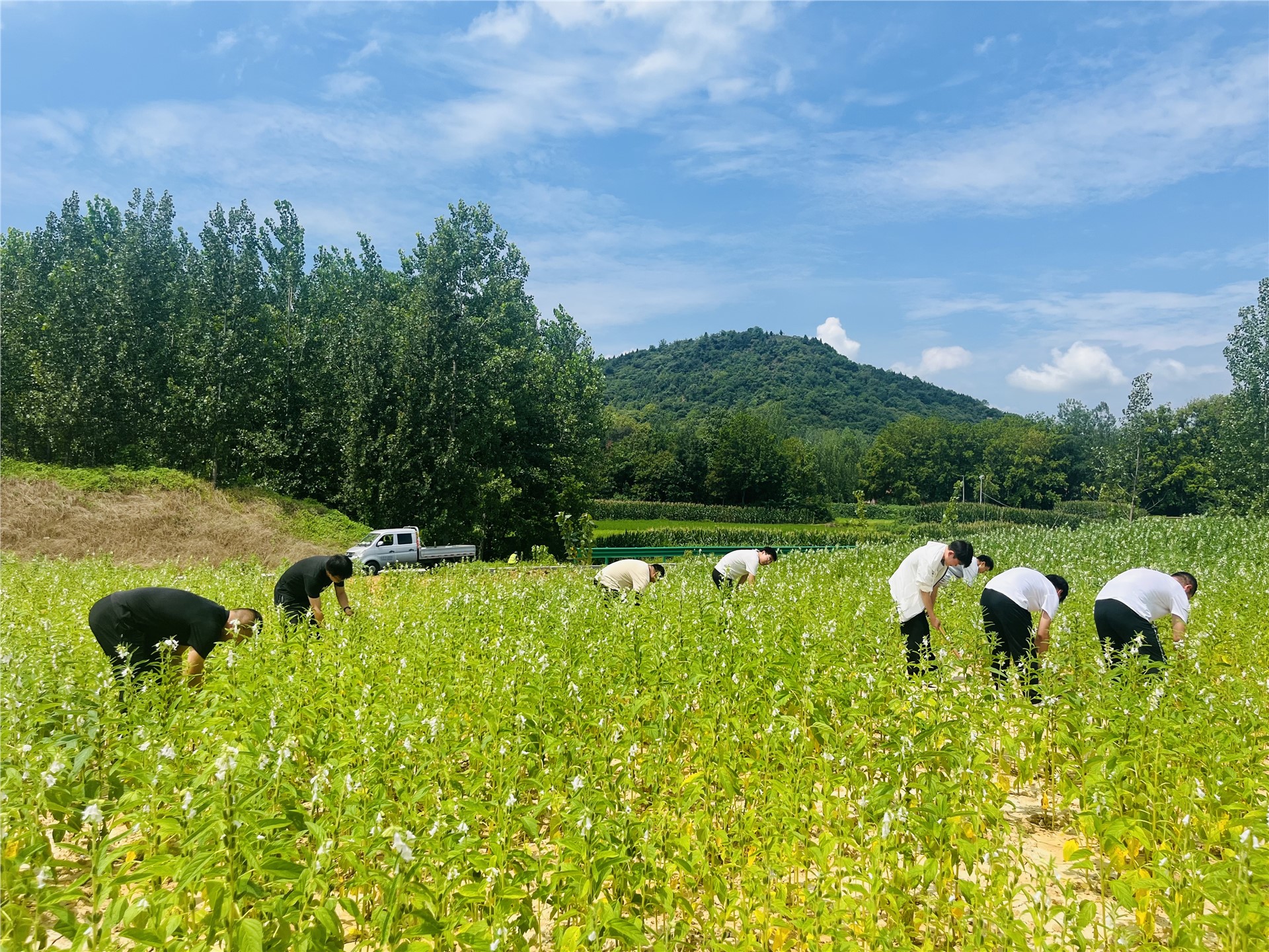 坪坝镇红阳村留守老人丁爹爹的芝麻地里,7名年轻干部拿起锄头、卷起裤管,为2亩芝麻施肥除草。