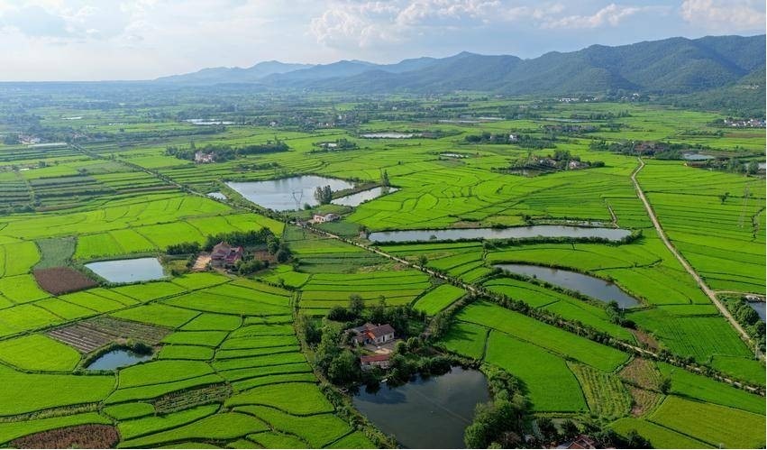 近日,在京山市新市街道城郊村,绿油油的中稻一望无际,与连绵起伏的山峦、蓝天白云交相辉映,构成了一幅美丽的田园风光图。
