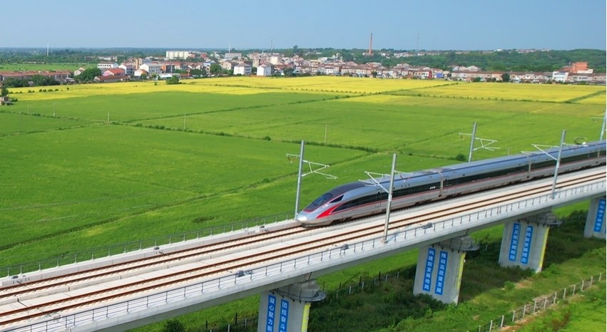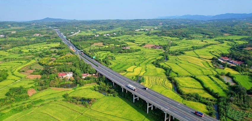 9月7日,京山境内武荆高速、许广高速与沪渝蓉高铁穿行于万亩稻田。翠绿与金黄交织的田畴如大地织锦,现代化交通线路似巨龙延伸,勾勒出乡村振兴与交通发展的和谐画卷。车辆在高速公路上飞驰,复兴号列车飞快驶过,展现出秋日田野里的生机与活力。(黄小明)