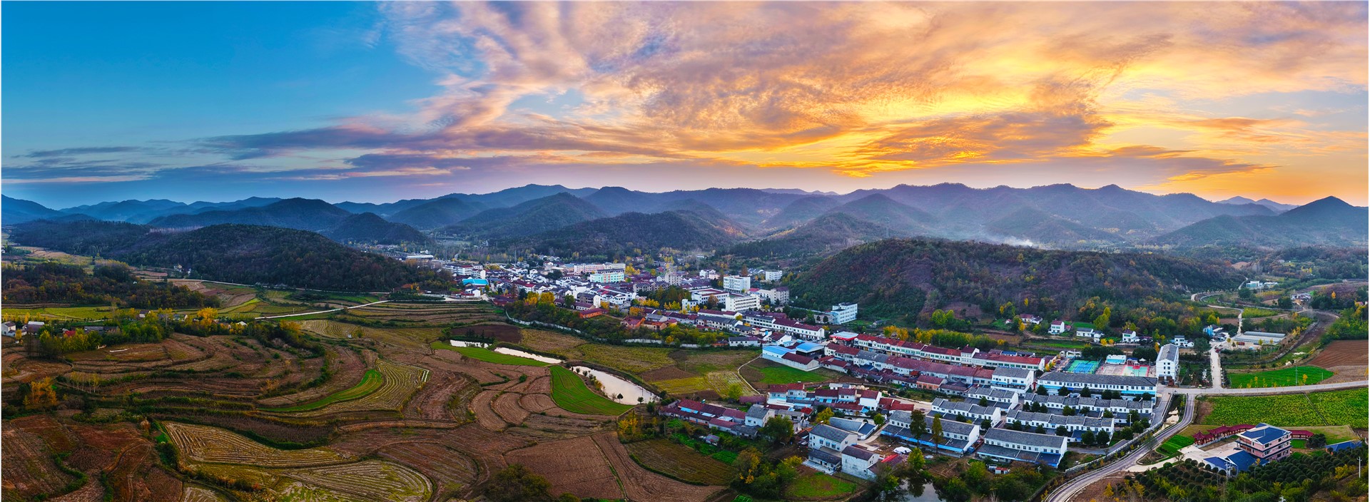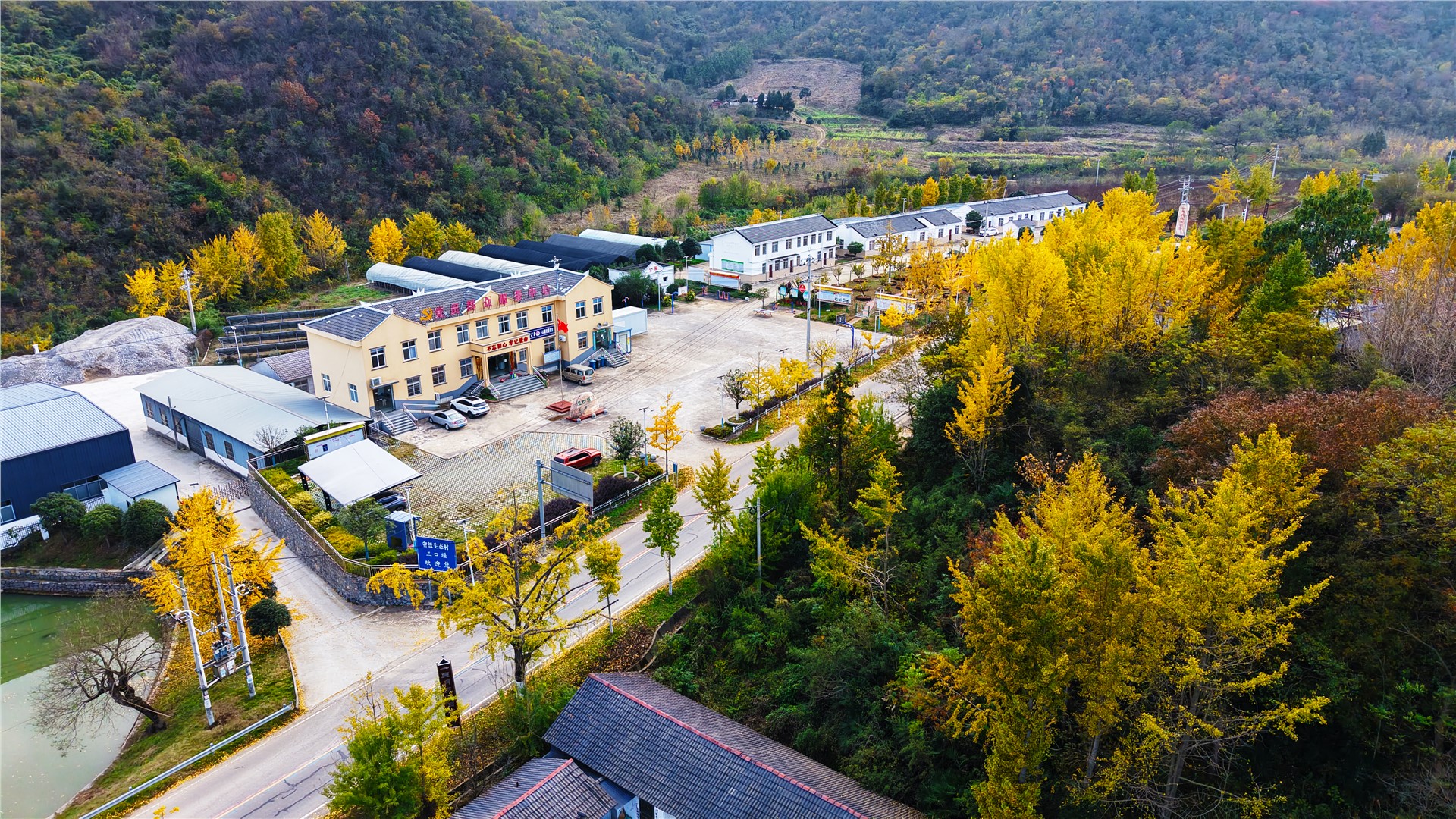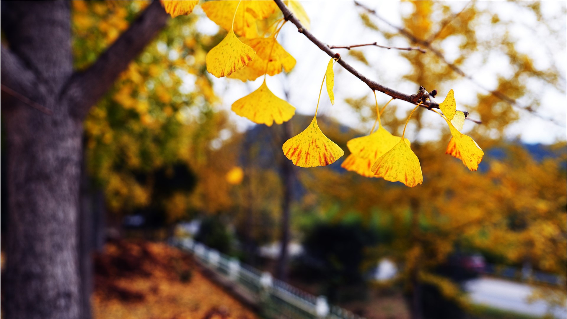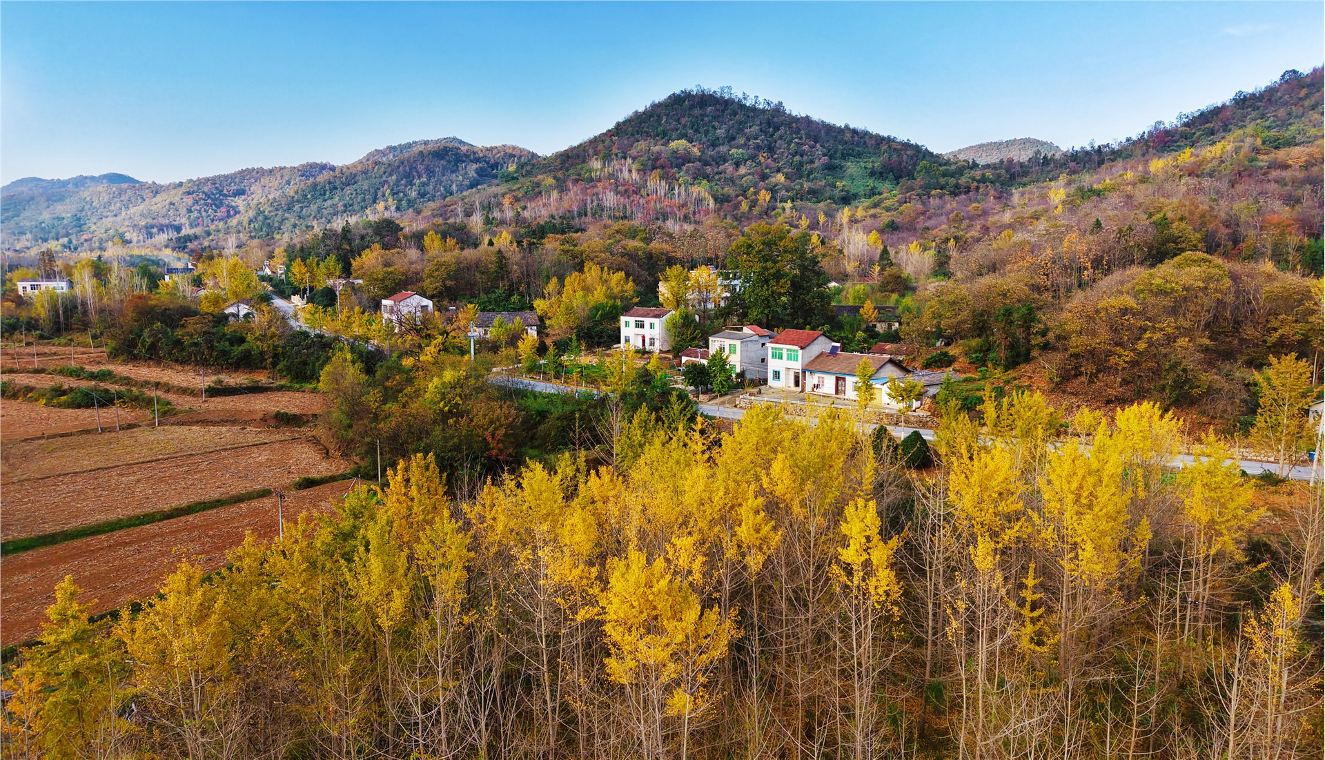 远处山峦笼着淡蓝雾霭,如宣纸晕染的底色,衬得近处村落里的白墙灰瓦愈发清雅。红顶的屋舍隐在银杏与杂树的斑斓间,某座院落前,一棵银杏将满树金辉倾泻在白墙上,落英铺满地面,似给院落绣了层金色纹样。